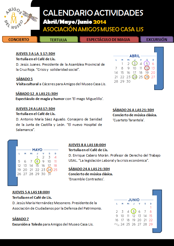 Las actividades comienzan el sábado 12 de abril, fecha en la que se celebrará el espectáculo de magia y humor del “Mago Miguelillo” a las 21:30 horas. Continuarán con la tertulia sobre “El nuevo Hospital de Salamanca” que conducirá Antonio María Sáez Aguado, Consejero de Sanidad de la Junta de Castilla y León, en el Café de Lis el jueves 24 de abril a las 17:30 horas. Además, el día 26 de abril el ‘Cuarteto Tarantela’ ofrecerá un concierto de música clásica en la Casa Lis a las 21:30 horas.