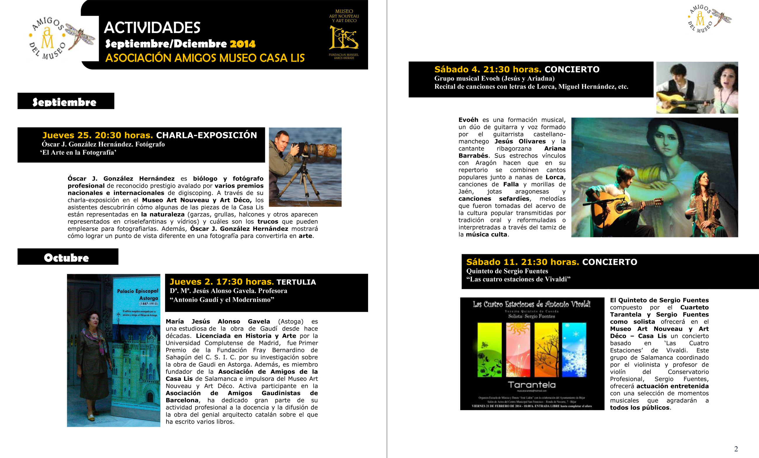 Las actividades comienzan el jueves 25 de septiembre, fecha en la que se celebrará la charla-exposición de Óscar J. González Hernández ‘El arte en la fotografía’ a las 20:30 horas. Continuarán con la tertulia sobre “Antonio Gaudí y el modernismo” que conducirá la profesora de Historia del Arte María Jesús Alonso Gavela en el Café de Lis el jueves 2 de octubre a las 17:30 horas. Además, el sábado 4 de octubre el grupo musical Evoeh ofrecerá un concierto con letras de Federico García Lorca, Miguel Hernández y canciones sefardíes en la Casa Lis a las 21:30 horas. Por su parte, el Quinteto de Sergio Fuentes (Cuarteto Tarantela más Sergio Fuentes como solista) interpretará “Las Cuatro Estaciones” de Vivaldi el sábado 11 de octubre a las 21:30. El mes se cerrará con una excursión a Toledo para los miembros de la Asociación de Amigos del Museo Casa Lis, donde visitarán la ciudad, el Palacio de Santa Cruz, el Museo del Greco, la Catedral, varias Sinagogas y el Museo Sefardí.