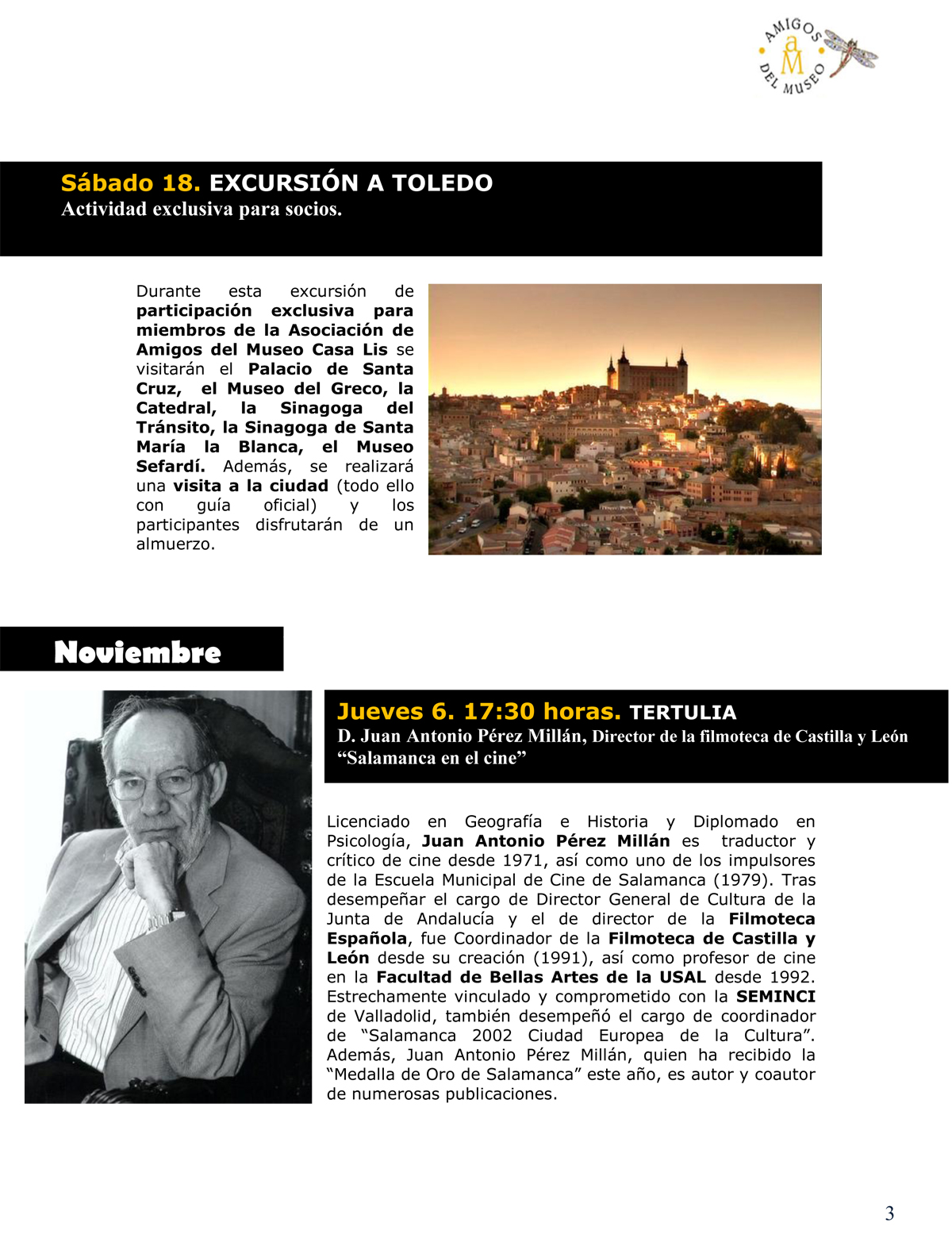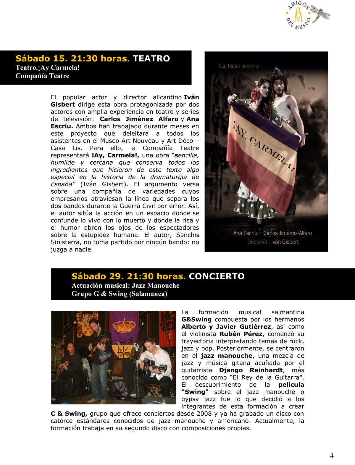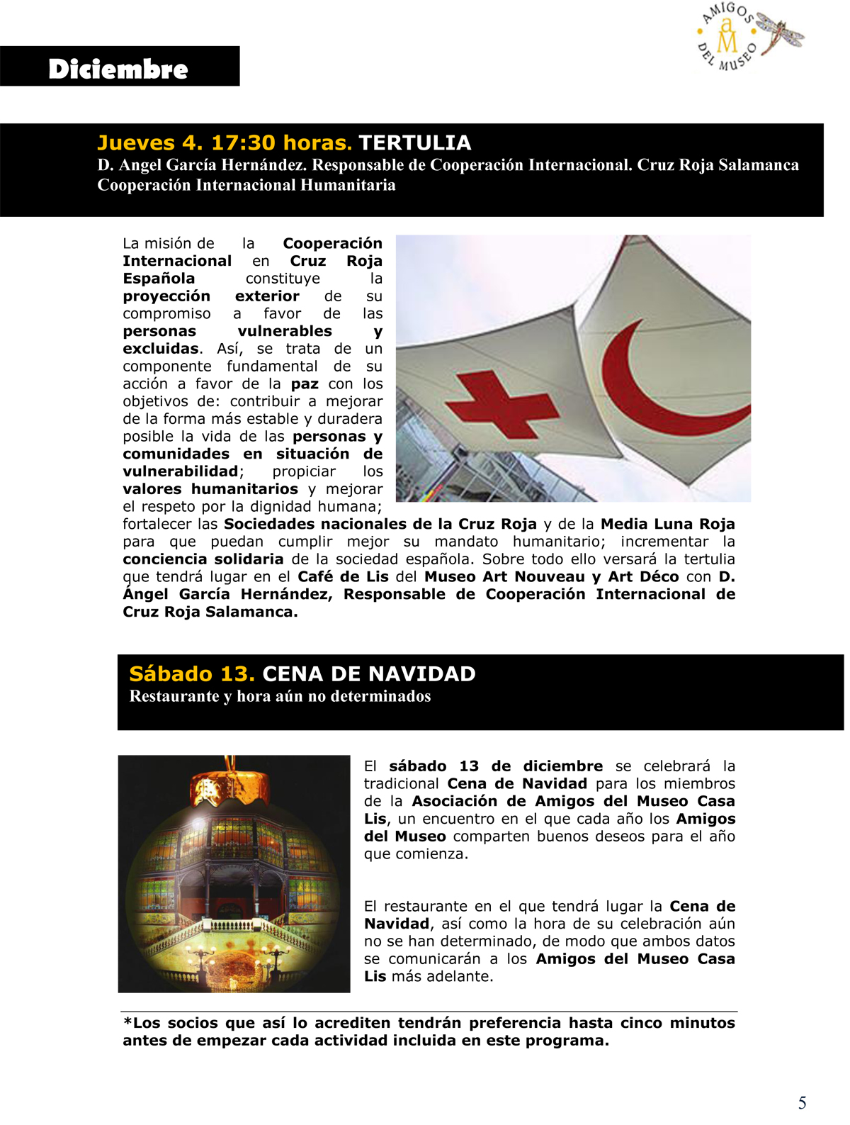 A estas actividades se suman las correspondientes al mes de noviembre, cuando tendrá lugar en el Museo Art Nouveau y Art Déco la tertulia “Salamanca en el cine” con D. Juan Antonio Pérez Millán (jueves 6 de noviembre, 17:30 horas). Posteriormente, se celebrará la función de teatro “¡Ay, Carmela!” con Compañía Teatre (sábado 15 de noviembre a las 21:30 horas), el concierto de música Jazz Manouche interpretada por la agrupación salmantina G & Swing (sábado 29 de noviembre, 21:30 horas) y ya en el mes de diciembre, El Café de Lis acogerá una nueva tertulia sobre ‘Cooperación Internacional Humanitaria’ a cargo de D. Ángel García Hernández, Responsable de Cooperación Internacional de Cruz Roja Salamanca (jueves 4 de diciembre, 17:30 horas).