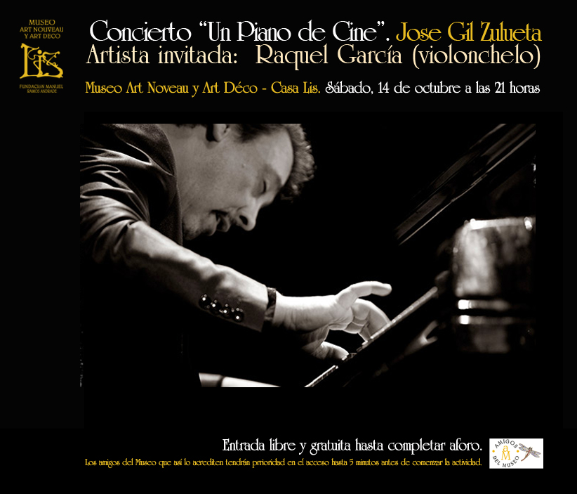 (Salamanca, 13 de octubre de 2017) El pianista y compositor Jorge Gil Zulueta ofrecerá un concierto “de cine” con la artista invitada Raquel García (violonchelo) la noche del sábado 14 de octubre (21 horas) en el Museo Art Nouveau y Art Déco – Casa Lis. La entrada al concierto organizado por la Asociación de Amigos del Museo es libre y gratuita, si bien los socios que así se acrediten (con su carnet de socio junto al DNI) tendrán prioridad en el acceso hasta 5 minutos antes del comienzo de la actividad.