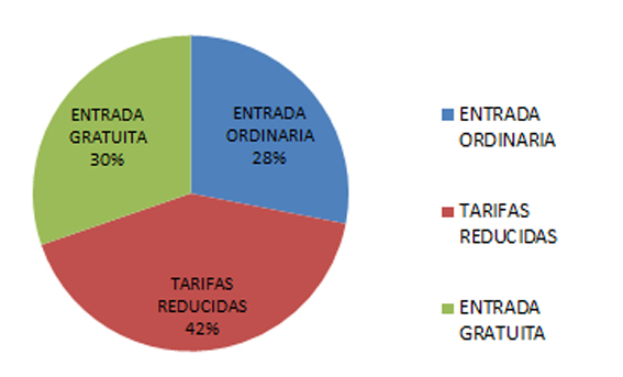 Además, el 30% de todos los visitantes se beneficiaron de la gratuidad en el acceso que tuvo lugar los jueves por la mañana, durante las jornadas de puertas abiertas celebradas con motivo de la festividad de San Juan De Sahagún y de las Ferias y Fiestas de la Ciudad o bien en el caso de los menores de 14 años, los residentes de Navasfrías, la localidad natal del mecenas Manuel Ramos Andrade, o los amigos del Museo. A ellos se sumaron los visitantes beneficiados por las tarifas reducidas, que superaron el 42% del total y se distribuyeron entre estudiantes, jubilados, grupos, desempleados y entradas conjuntas con otros museos.