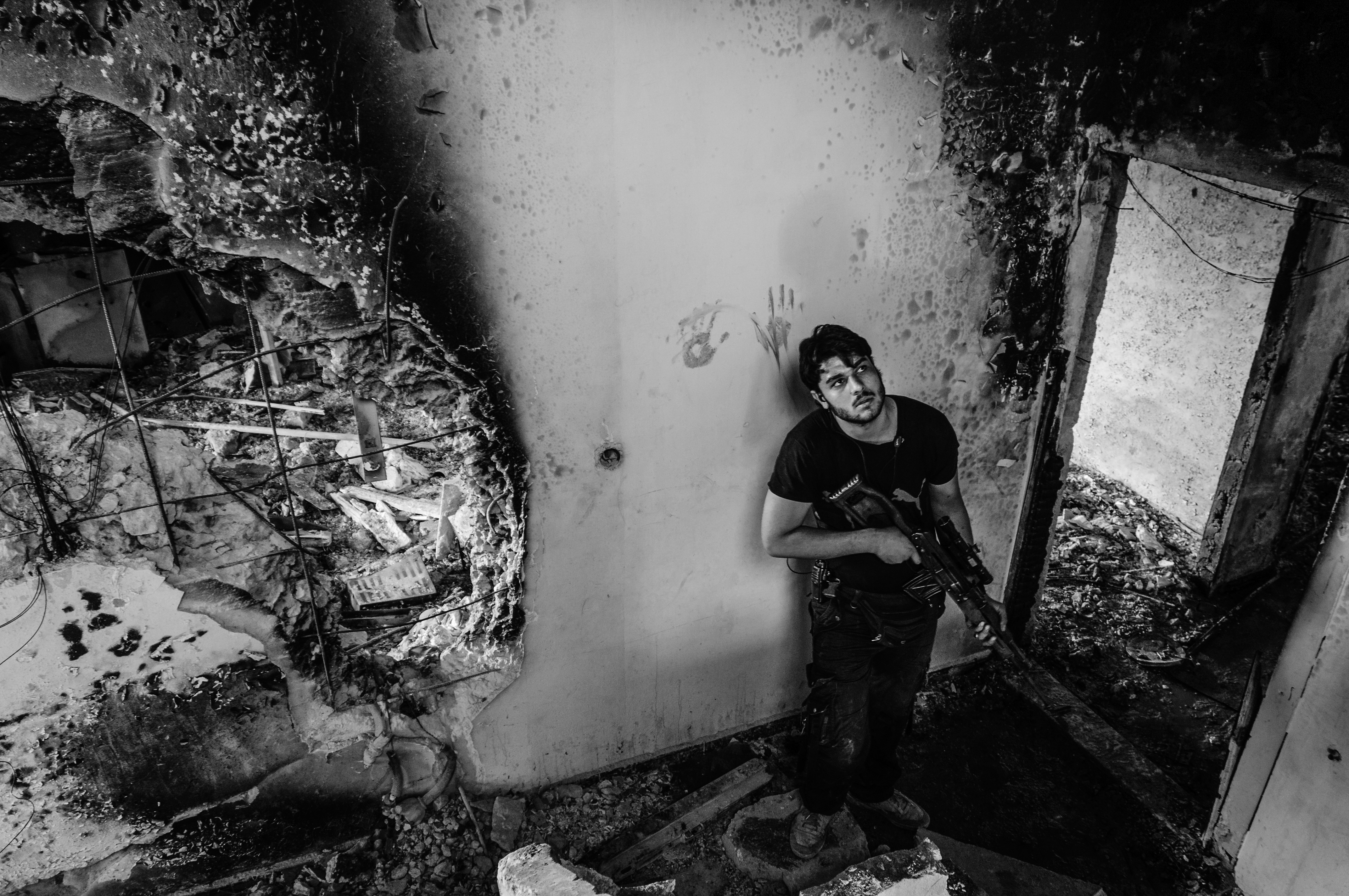 Alberto Prieto. Francotirador rebelde del Ejército Sirio Libre (ESL) vigila las posiciones de sus objetivos, los soldados del ejército regular sirio desde el interior de un inmueble completamente destruido por la guerra. Alepo, Siria. 2012.