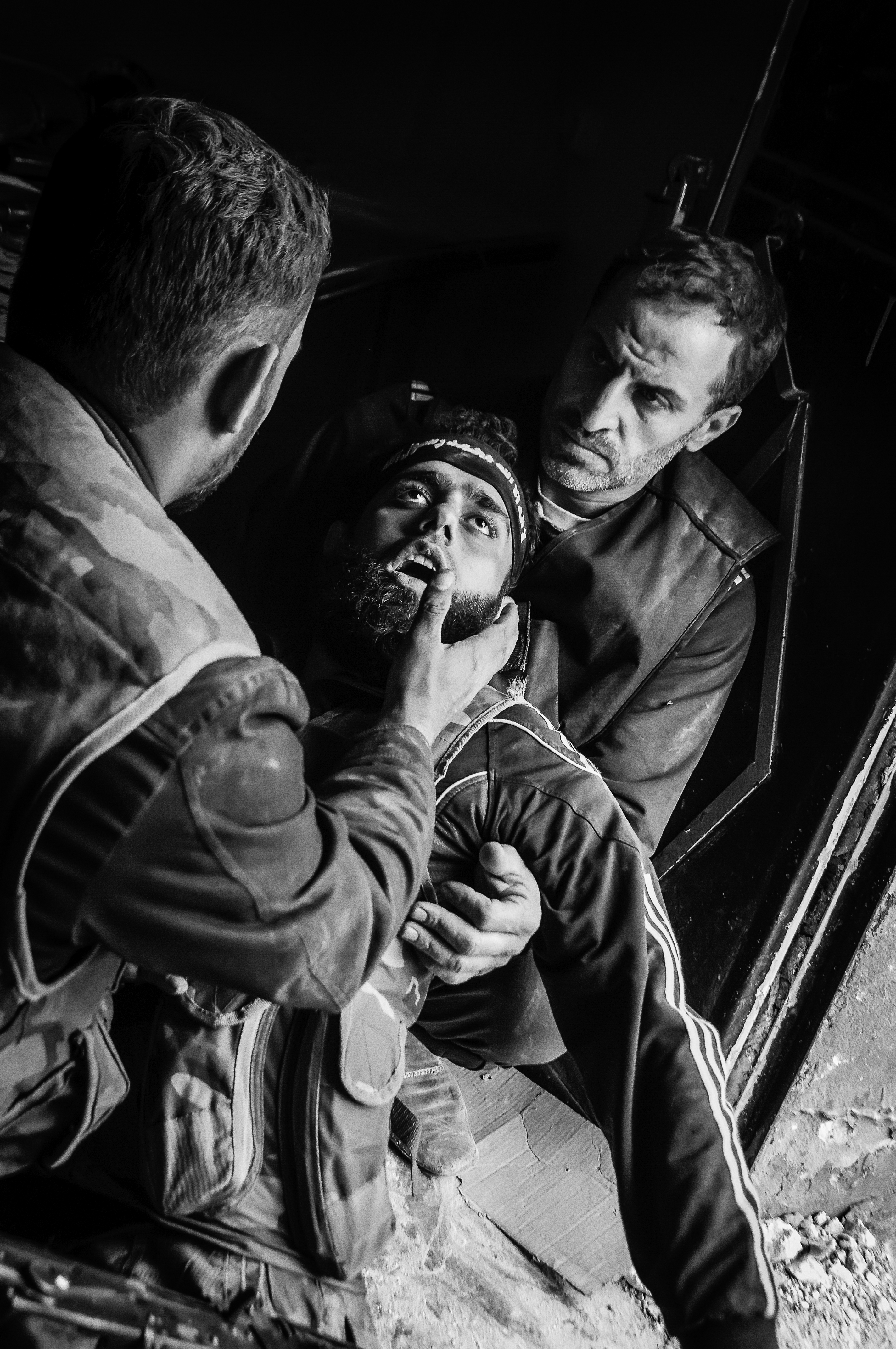 Alberto Prieto. Combatiente rebelde del Ejército Sirio Libre (ESL) es reconfortado en sus últimos momentos de vida por sus compañeros, tras recibir un disparo mortal en un combate con soldados del ejército regular sirio. Alepo, Siria. 2012.