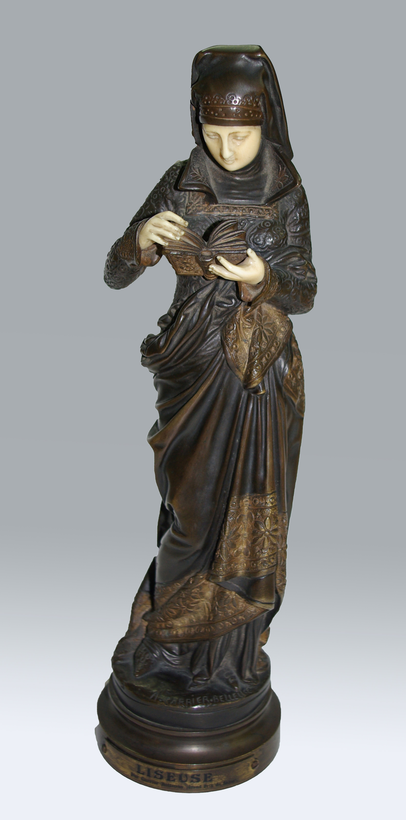 Precursora de las criselefantinas Art Déco de los años 30, la obra “Lectora” – “Liseuse” es una figura de bronce y marfil con pátina dorada que representa a una joven sosteniendo el libro que lee. Vestida al estilo prerrafaelista con bordados muy elaborados, la pieza corresponde a 1880 y cuenta con la firma de Ernest Carrier-Belleuse (1824-1887), escultor y pintor francés que ingresó en la Escuela de Bellas Artes de París en 1840. Carrier-Belleuse fue alumno del escultor David d’Angers antes de trasladarse a Londres, donde realizó diseños para Minton China Works. Tras regresar a Francia, expuso su primera obra en el Salón Nacional (1859), contó con el patrocinio de Napoleón III para la realización de esculturas de bronce monumentales y colaboró con Rodin durante varios años, quien trabajó como marmolista en su taller. En 1876, fue nombrado director de arte de la Manufacture Nationale de Sèvres, dónde incorporó varios modelos propios. Sus obras han servido de inspiración a otros artistas del siglo XVIII como Jean-Antonie Houdon y Clodion.