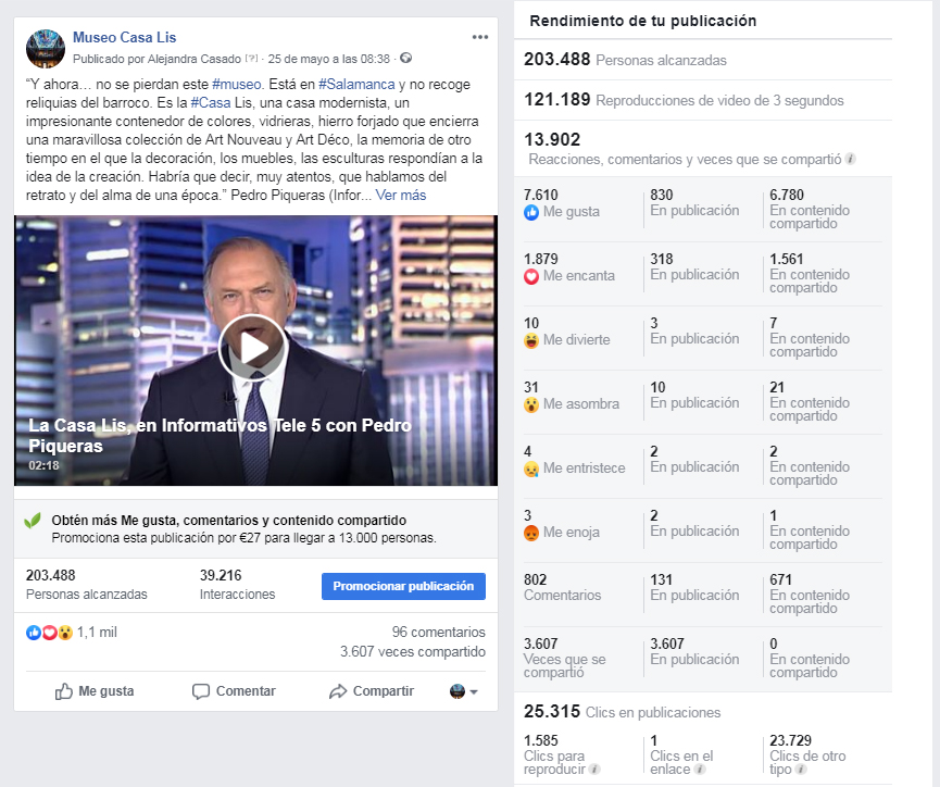 La multiplicación de este reportaje en el perfil del Museo en la red social del Facebook ha supuesto un alcance de más de 200.000 personas, con más de 39.000 interacciones, más de 6.700 veces compartido y 7.610 “Me Gusta”, lo que supone una gran repercusión para la institución.