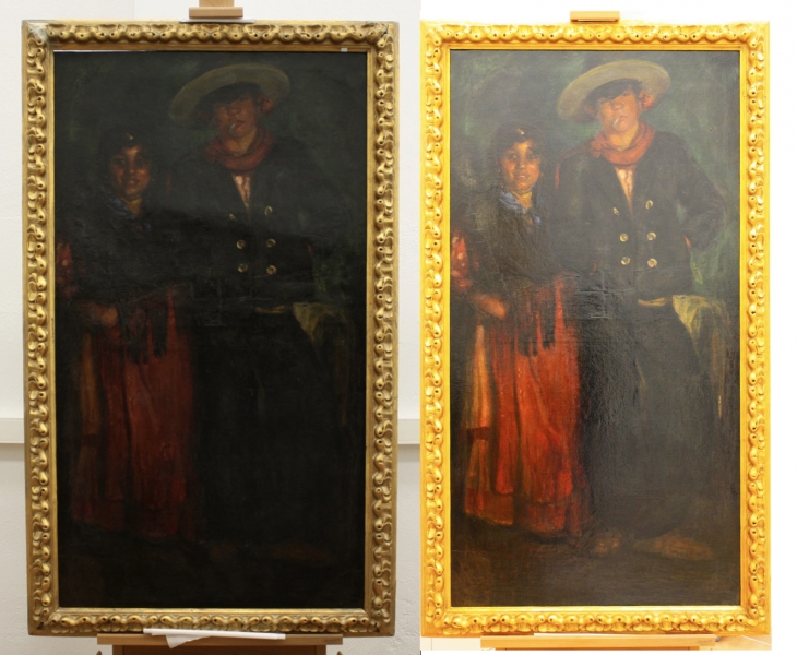 Antes y después de la restauración en la pintura de Federico Beltrán Massés. «Pareja de Gitanos«.