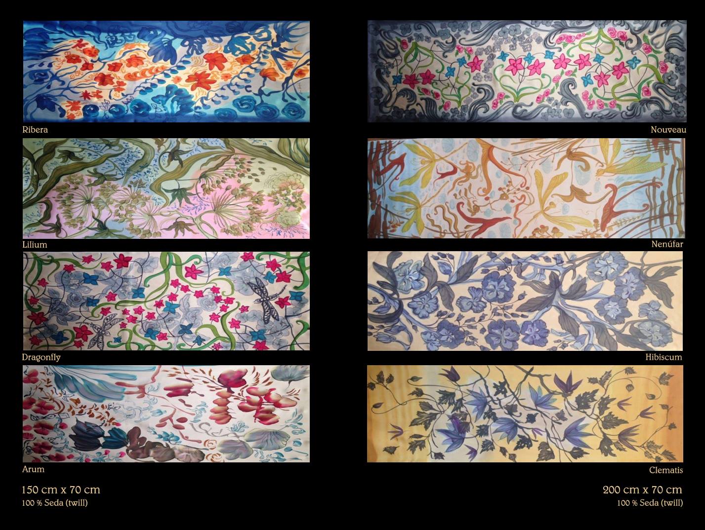 Así, cada pañuelo retrata y refleja, es más que un complemento: es vegetación acogedora, viento cálido, agua espejeada, silencio interior, paseo lírico y comprensión intuitiva plasmada en un tejido único, fruto de una de las más hermosas transformaciones de un ser vivo sobre la tierra: la crisálida se transforma en mariposa y la seda se transforma en obra de arte.