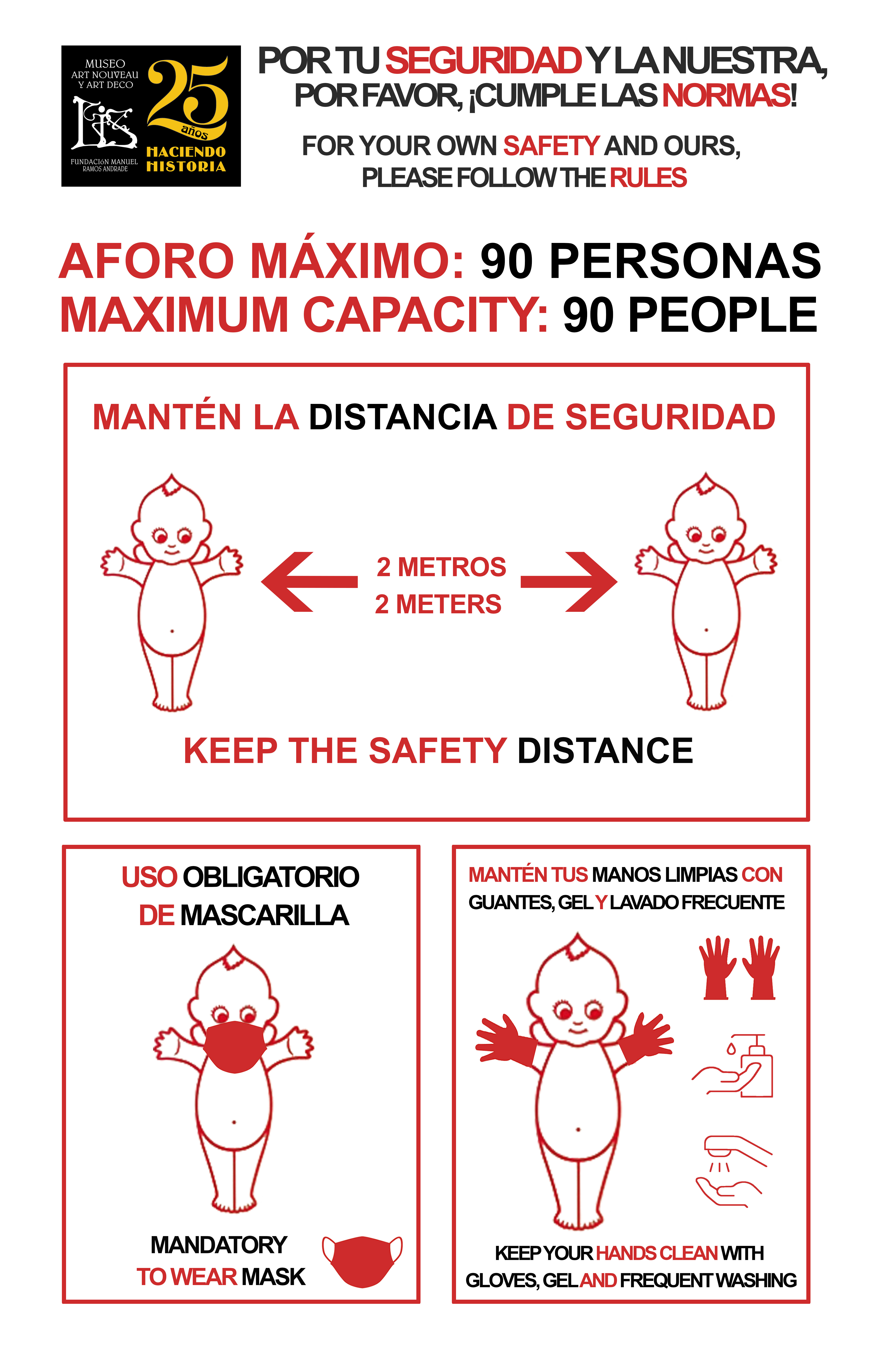 La reapertura del Museo Art Nouveau y Art Déco – Casa Lis se realizará el martes 26 con todas las medidas de seguridad y de carácter sanitario necesarias para ello, lo que ha supuesto una profunda y minuciosa limpieza y desinfección de todos los espacios de la Casa Lis previa a su apertura, medida que se repetirá diariamente en la institución donde también se ha establecido una reducción de su aforo total a 90 personas y limitaciones en el número de visitantes que pueden encontrarse al mismo tiempo en cada sala, así como la circulación diferenciada en el edificio para el acceso y salida del público y para el tránsito interior a través de dos escaleras distintas para subir y bajar de la primera planta y señalización específica indicando estos itinerarios para el público. De este modo, se evitarán aglomeraciones y será posible mantener la distancia de seguridad recomendada entre los visitantes y entre ellos y los empleados del Museo. Además, se han instalado mamparas de seguridad en la recepción para minimizar el contacto entre visitantes y empleados durante el acceso a la Casa Lis, objetivo cuya consecución también se persigue con la retirada del libro de visitantes.