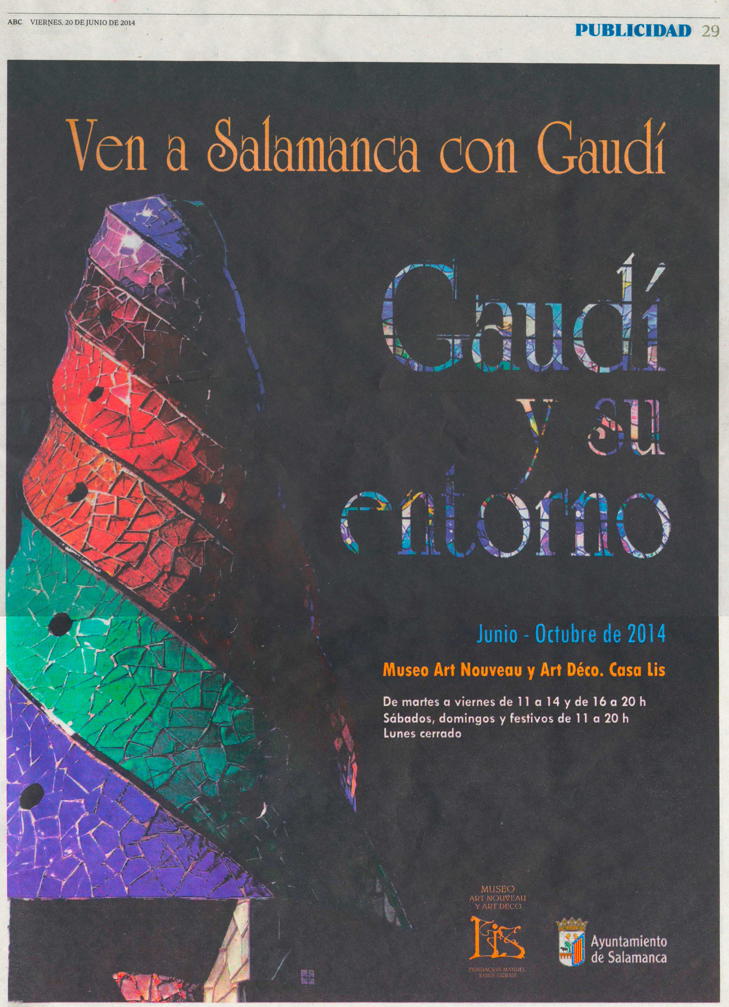 (Viernes, 25 de julio de 2014) La exposición ‘Gaudí y su entorno’ inaugurada en el Museo Art Nouveau y Art Déco el pasado 20 de junio ha recibido casi 11.000 visitantes durante su primer mes de exhibición. La procedencia mayoritaria de los visitantes de la Casa Lis durante este período ha sido de otros países, de modo que un 54,8% del total eran extranjeros, mientras el 45,2% de los visitantes provenían de otras comunidades autónomas españolas.