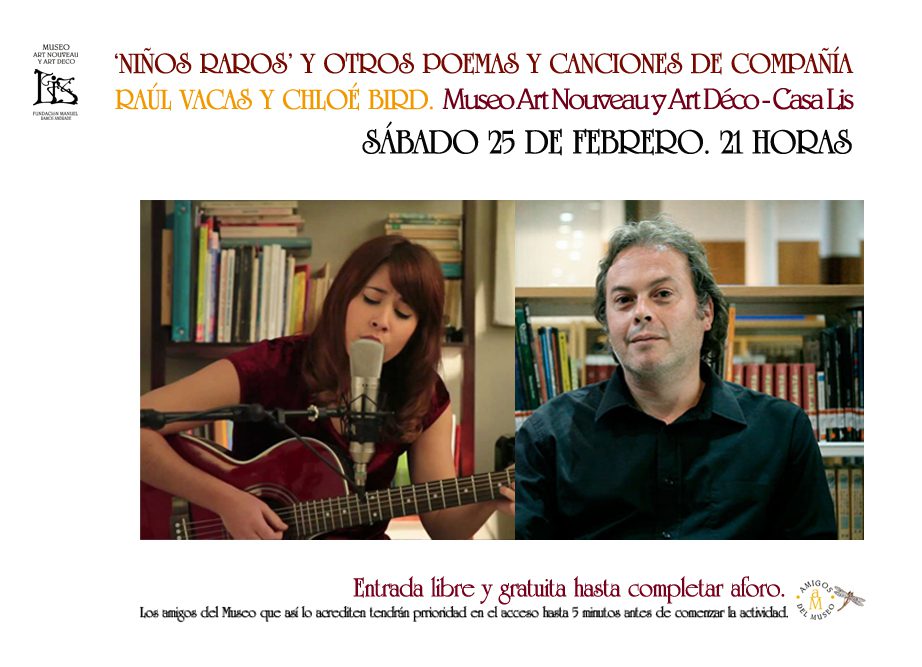 (Martes, 21 de febrero de 2017) La niña cacto, el niño con cara de gamusino, la niña sombra y el xilofoñiño son algunos de los “Niños raros” que habitarán el Museo Art Nouveau y Art Déco el próximo sábado 25 de febrero. La velada poética sobre las criaturas nacidas de la imaginación de Raúl Vacas e ilustradas por Tomás Hijo será musicalizada por Chloé Bird y sus canciones de compañía, melodías que deleitarán a todos los asistentes en la Casa Lis partir de las 21 horas. El acceso a esta actividad organizada por la Asociación de Amigos del Museo es libre y gratuito hasta completar aforo, sin bien los socios que así se acrediten (con su carnet de socio junto al DIN) tendrán preferencia hasta cinco minutos antes del comienzo.