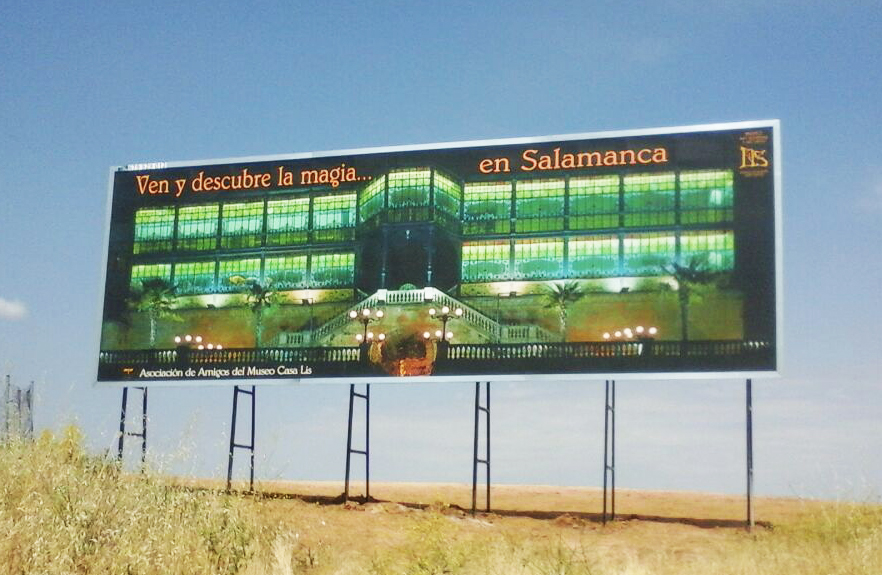 (30 de junio de 2015) El Museo Art Nouveau y Art Déco se promocionará entre los viajeros que recorren la autopista del Noroeste o AP-6, también conocida como autopista ‘Las Rozas-Adanero’ o simplemente como ‘Carretera de La Coruña’, así como la AP-51 o Conexión Ávila y la N-110. Para ello, la Casa Lis cuenta desde el mes de junio con una valla publicitaria instalada a la altura de Villacastín en el enlace de la AP-6 con la AP-51 que une la Autopista del Noroeste con Ávila y la N-110 que discurre paralela y extiende su trazado a través de Soria, Segovia, Ávila y Plasencia. Gracias a la Asociación de Amigos del Museo Casa Lis, que ha promovido y sufragado esta acción promocional, los conductores y pasajeros verán en este emplazamiento una imagen de la fachada sur del museo de 12 metros de anchura por 4 de altura con una invitación a visitarlo.